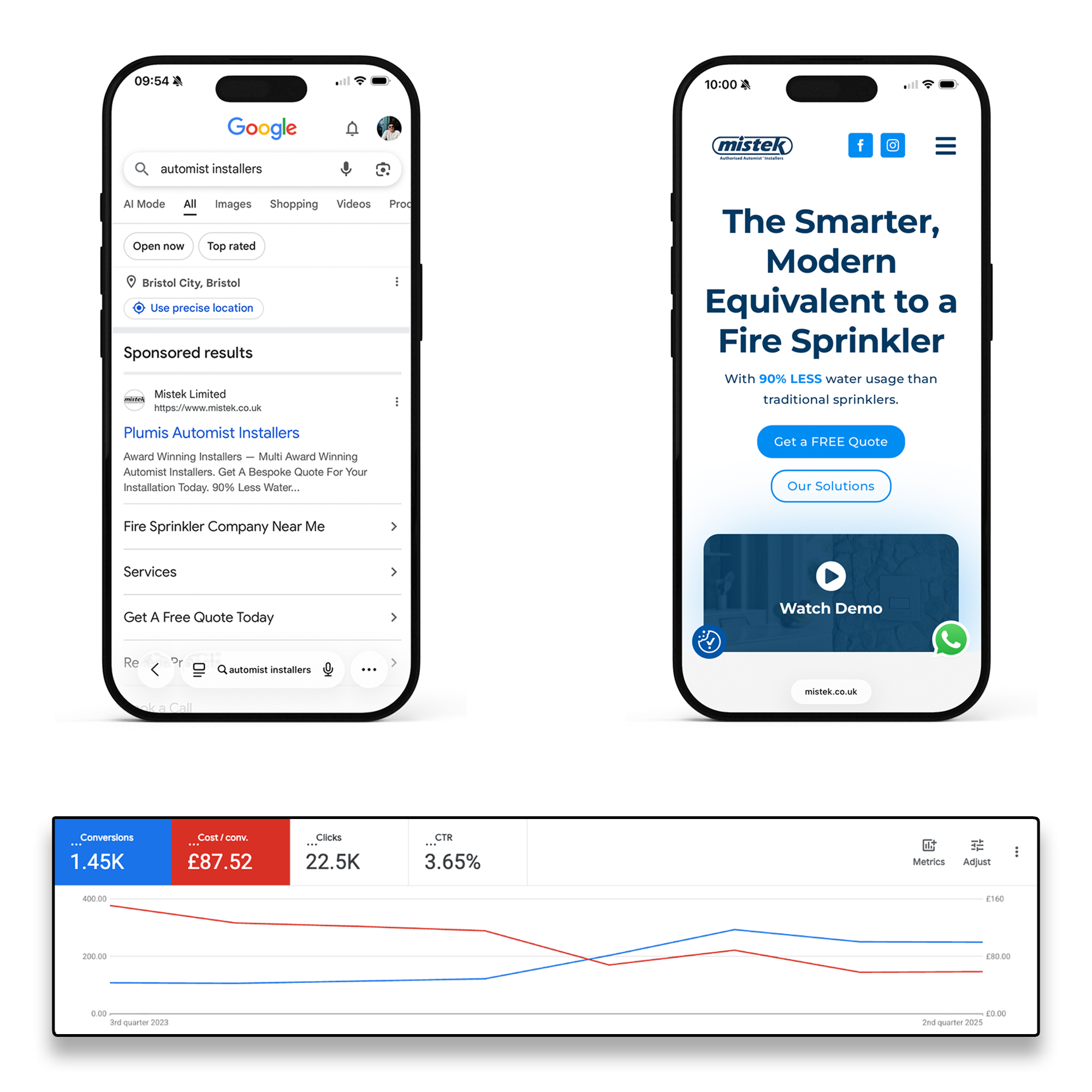 Mistek are a multi-award winning national fire safety specialist, and one of the leading accredited installers of the Automist® water mist fire suppression system - a modern alternative to traditional sprinkler systems. Mistek approached us in 2024 having run ads in house previously, but now requiring a reliable, effective route to profitable scale through expert management.